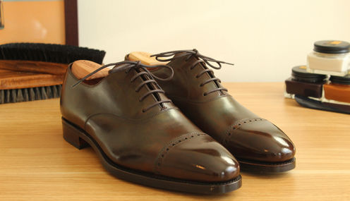 It was an exciting day when I was able to get my hands on these Carmina Captoe Oxfords, pre-owned, but un-worn (they were purchased and unboxed, but never worn). Not sure why the person didn’t just return them, but I am glad they didn’t! I wasn’t a huge fan of the style (punched captoe), or the color since I have a few pairs of medium brown shoes already, but I thought they would be great for a little experiment. I decided to take the finish down and re-stain them to a darker brown (a color I did not yet have). In doing so I wanted to create a textured effect so they weren’t just solid dark brown; this required 3-4 coats of hand brushing. Once the stain was complete and buffed, I polished them up, adding extra shine to the toe caps and the heels.